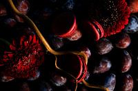 Lekkere rode bitterkoekjes, in combinatie met rode bloemen, fragiele tak, paarse pruimen. Complexiteit van zintuigen op zijn best