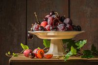 Een zomers stilleven van prachtige paars/rode pruimen, vol van sap, gecombineerd met de frisse, zoete smaak van donkerrode, overrijpe kersen geeft je het echte zomergevoel. Een familie momentje, pruimen en kersen zijn allebei steenvruchten en behoren tot de rozenfamilie (Rosaceae).