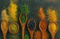 Een kleurrijke en brede compositie met houten lepels vol specerijen, kunstzinnig weergegeven in mozaïekstijl. Ideaal voor een moderne of landelijke keukenwand.