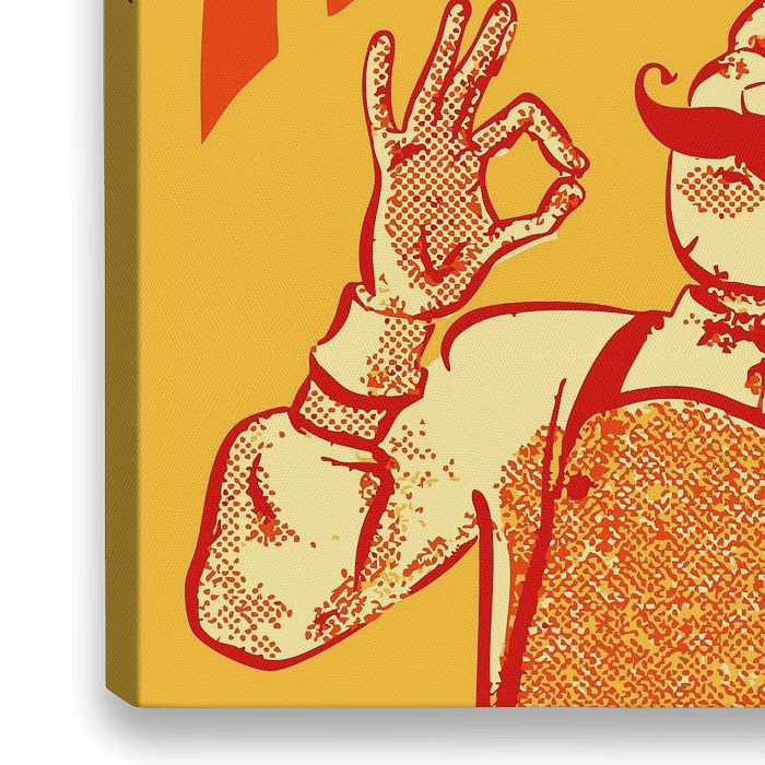 Een kunstdruk met een kok en de tekst "Bon Appétit". Het hele werk is uitgevoerd in geel en rood.