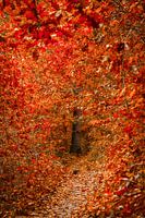 Digitale foto van een smal bospad in de herfst op landgoed Buitenlust in Halsteren (Brabant). De prachtige warme oranje en rode herfstkleuren van de bladeren maken dit herfstlandschap compleet. Doordat het grootste gedeelte van de bladeren nog aan de bomen hingen was het een ware zoektocht om het bospad te kunnen volgen.