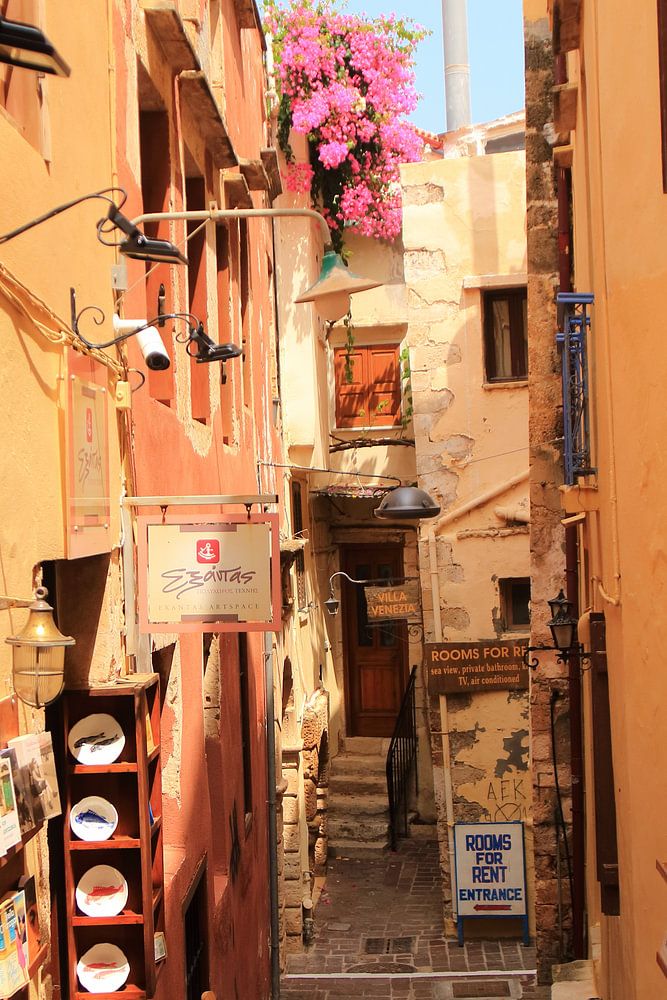 Smal, nauw, oud, karakteristiek , vintage straatje in het centrum van de stad Chania op het Griekse eiland Kreta.