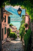 Een geplaveid pad met weelderig groen baant zich een weg tussen pittoreske huizen met kleurrijke luiken. Een antieke lantaarn werpt een warm licht op het tafereel, terwijl het uitzicht reikt over het glinsterende meer en de majestueuze bergen. Dit dromerige steegje lijkt verhalen uit een andere tijd te fluisteren en nodigt je uit om het…