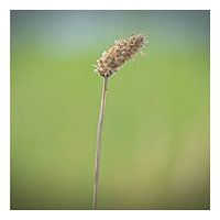 De foto bevat het zacht bruine van de Smalle Weegbree op een achtergrond van zacht blauw (lucht) wat overloopt naar zach groen.