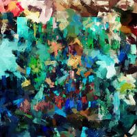 De titel van dit abstracte werk, "Smaragda and Rubies and the Tale of Turquoise", komt uit de laatste regels van Rainer Maria Rilke' gedicht "The Magi". Het past bij de rijke, verzadigde juweelkleuren in dit werk, dat ik heb ontleend aan een feestelijke afbeelding van een versierde kerstboom. Eerder koel maar met warme accenten en eerder donker maar met contrasterende lichte gebieden, heeft het werk een "hygge" karakter en past het bij het donkere seizoen met zijn feestelijke accenten.