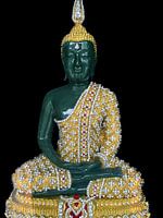 Foto van een Budha van Smaragd (+/- 60 cm), vol gehangen met edelstenen en halfedelstenen.