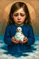 Een ontroerend portret van een jong meisje dat een bijna smeltende sneeuwpop in haar handen houdt. De zachte penseelstreken en warme tinten versterken het gevoel van kwetsbaarheid. Haar ene traan vertelt een verhaal van verlies en ontgoocheling maar ook van de puurheid waarmee kinderen hun wereld ervaren.