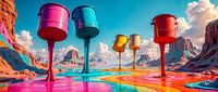 Het majestueuze landschap doet denken aan Monument Valley, maar in plaats van droge woestijn en stoffige grond stromen hier eindeloze stromen van levendige kleuren. Gigantische emmers kleur zweven met surrealistische gratie boven de grond, pulserende stromen magenta, cyaan, geel en rood stromen uit hun open monden. De kleuren vermengen zich op het reflecterende oppervlak en hullen de hele vallei in een oogverblindende kleurenvloed.