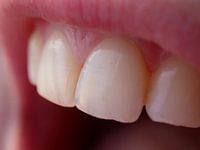 Close-up van het gebit van een jonge vrouw; ingezoomd op de voortanden.