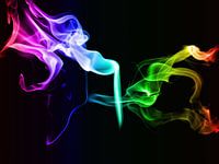 Rook in regenboogkleuren op een zwarte achtergrond wat een abstract beeld oplevert.