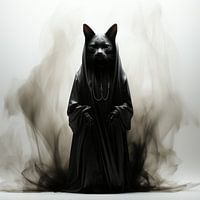 In een wereld van minimalistische eenvoud staat een zwarte kat rechtop, gehuld in een zwarte cape die als een mysterieuze wolk van rook naar beneden dwarrelt. Het beeld straalt een ingetogen kracht uit, waarin elke lijn en vorm doordacht is. De kat, als een silhouet van nachtelijke elegantie, draagt zijn cape als een schaduwachtige…