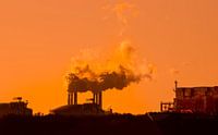 Het licht van de ondergaande zon schijnt door de rook van één van de fabrieken in de haven van Rotterdam. Ik heb het contrast verhoogt, zodat de silhouetten van de schoorstenen en het passerende containerschip lekker scherp afsteken.