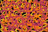 Abstracte digitale tekening in de kleuren geel, oranje en bordeaux rood op een zwarte achtergrond. Staat mooi in een modern interieur