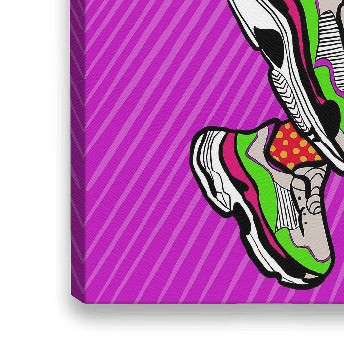 Digitale illustratie van vrouw met sneakers. Vrolijke kleuren als paars, groen, geel, rood.