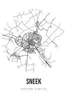 Zwart-witte landkaart, stratenplan of plattegrond van Sneek. Sneek is gelegen in de gemeente Sudwest-Fryslan, provincie Fryslan. Op de stadskaart zijn alle openbare wegen in Sneek opgenomen. Verder is de kaart voorzien van de coördinaten van het centrum van Sneek.