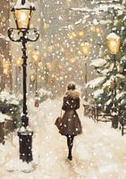Sneeuw en Licht - Dit winterse straattafereel toont een vrouw die alleen door een besneeuwde straat loopt, omgeven door gloeiende straatlantaarns onder een zachte sneeuwval, wat een gevoel van warmte en stilte uitstraalt.