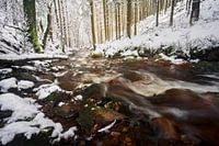 Een mooie beek stroomt door de wit besneeuwde Ardennen.
