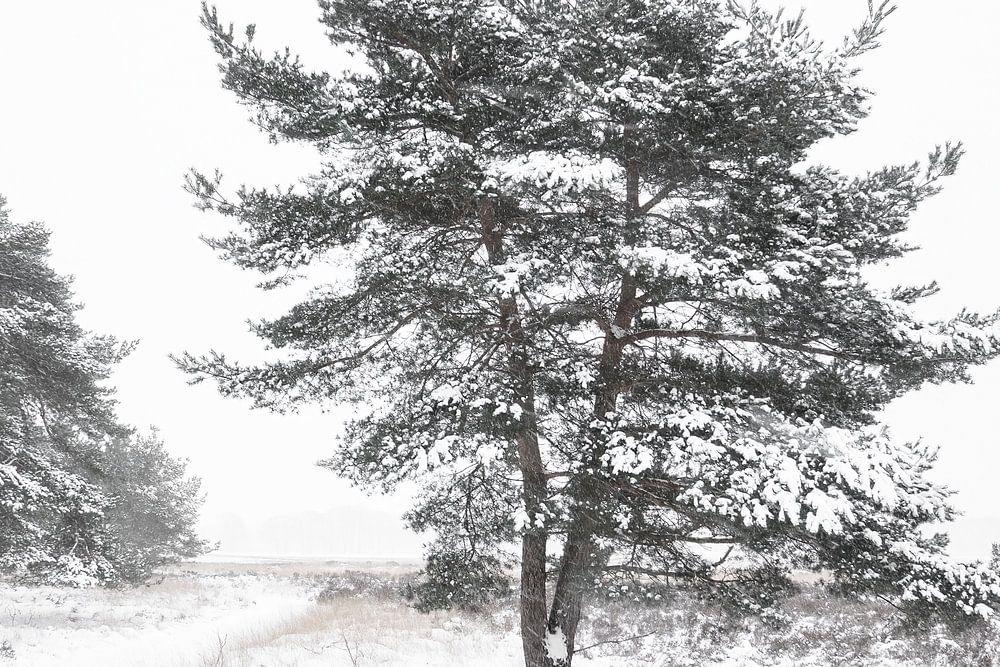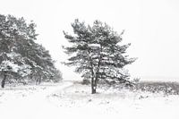 Sneeuw in nationaal park de Hoge Veluwe in Nederland. Sinds tijden was er een hele dikke laag sneeuw gevallen. Het landschap veranderde in een sprookjesachtige omgeving. De foto`s lijken door de sneeuw bijna zwart-wit foto`s.