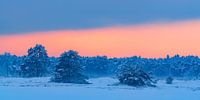 Sneeuwwinterlandschap in het stuifduingebied Hulshorsterzand in het natuurgebied de Veluwe in Gelderland, Nederland tijdens een koude winterse zonsondergang.