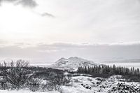 Minimalistisch rustgevend sneeuw landschap met een berg in de winter in IJsland.