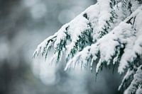 Een laagje sneeuw op een naaldboom.