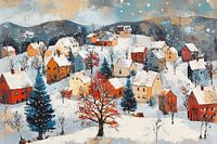 Sneeuwdorp - Dit kerstschilderij toont een levendig dorp onder een dikke laag sneeuw, met kleurrijke huizen en besneeuwde dennenbomen tegen een achtergrond van heuvels, uitgevoerd in een impressionistische stijl.