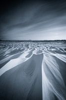 Sneeuwduinen in het Nationaal park Lauwersmeer in Groningen na een sneeuwstorm in zwart wit. De mooie structuren leiden je naar de horizon. De zon zogt voor een mooi slep tussen licht en schaduw