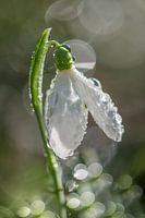 Een prachtige sfeervolle macro-opname van een sneeuwklokje met dauwdruppels. De dauwdruppels zorgen voor een prachtige sfeer. En het warme zonlicht licht de dauwdruppels mooi op. Wat voor een fraai bokeh zorgt.