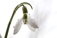 Sneeuwklokje met regendruppels afstekend tegen de lichte lucht.