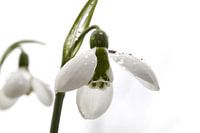 Sneeuwklokje met regendruppels afstekend tegen de lichte lucht.