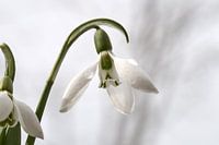 Sneeuwklokje met regendruppels afstekend tegen de lichte lucht.