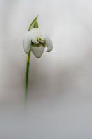 Een macro foto van een sneeuwklokje in een witte omgeving.