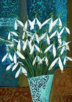 Sneeuwklokjes Vaas | Snowdrop Beauty Vibe - Dit bloemen schilderij toont een kleurrijke vaas vol met sneeuwklokjes, gepresenteerd tegen een abstracte achtergrond van levendige tinten blauw en bruin, wat een frisse en moderne uitstraling creëert.