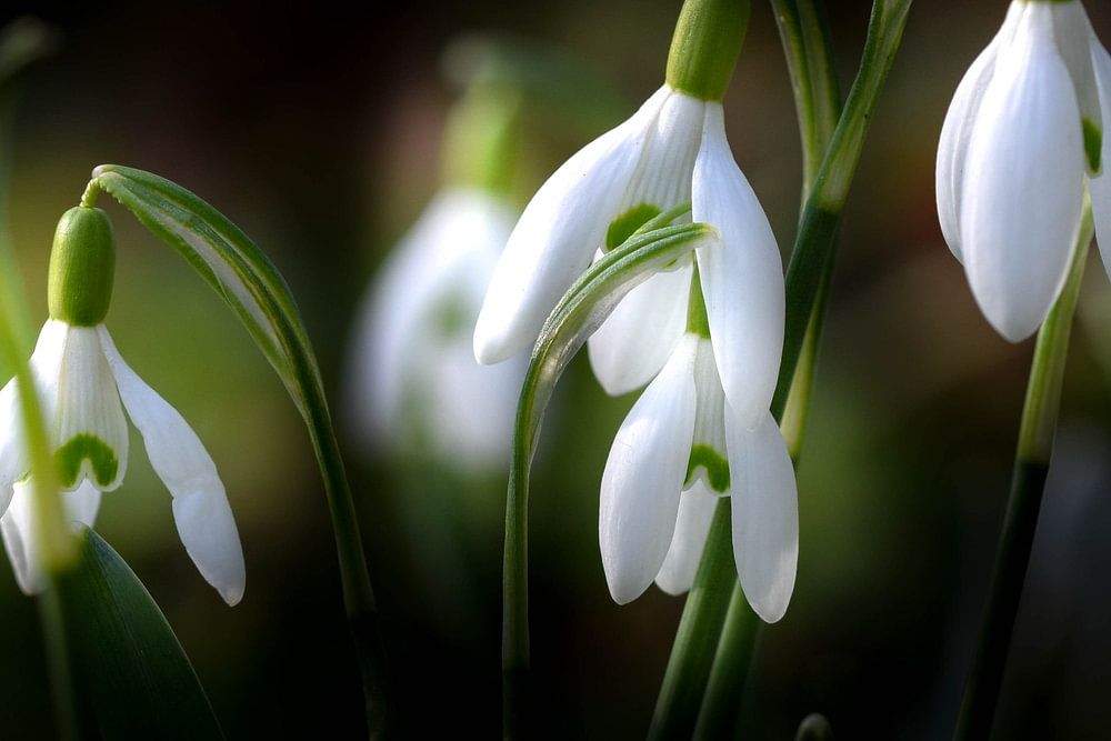 Groepje met witte bloemetjes van sneeuwklokjes die in bloei staan in het vroege voorjaar aan het begin van de lente