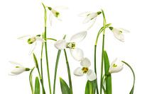 Een macro opname van sneeuwklokjes met een witte achtergrond.