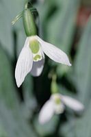 Witte sneeuwklokjes in portretformaat tegen groene bladeren