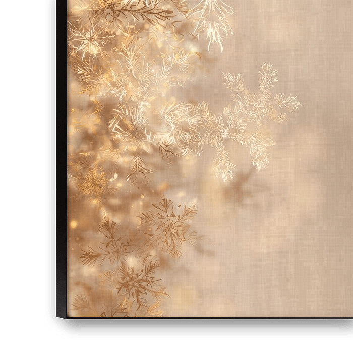 Deze verfijnde compositie toont sierlijke sneeuwkristallen die vanuit de linkerzijde het beeld vullen, badend in een warme gouden gloed. De gedetailleerde structuren lijken haast op handgetekende patronen, met een sprankelende afwerking die subtiel overgaat in een zachte, neutrale achtergrond. Het werk ademt rust, klasse en een winterse magie die perfect is voor feestelijke toepassingen of als elegante wanddecoratie.