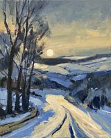 De zon komt op boven het dik besneeuwde Zuid Limburgs Heuvelland. De bossages, graften en heggen snijden door het winterlandschap. Blauwe schaduwen verraden dat het een koude ochtend is.