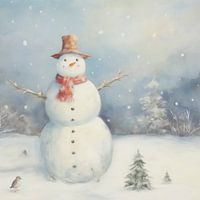 Een vrolijke sneeuwman. De pastelkleuren en het lage contrast zorgen voor een serene uitstraling. Breng de gezelligheid van kerst in huis met dit charmante werk!