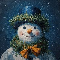 Sneeuwpop Onder Sterren - Een dikke, vrolijke sneeuwkop kijkt je recht aan — niet stijf of afstandelijk, maar alsof hij net een grapje maakte en nu wacht op je reactie. Het eerste dat opvalt is het ronde, sterk getextureerde gezicht: dikke olieverfstreken die samen één knisperend, wit oppervlak vormen, met twee simpele kolen-ogen, een…