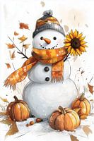 De sneeuwpop staat in het midden en wordt omringd met herfstachtige details, zoals zonnebloemen, pompoenen en herfstbladeren. Geniet van sneeuw en pompoenen tegelijk!