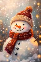 Met een brede glimlach en sprankelende ogen schittert de kleine sneeuwpop in een magisch winterlandschap. Zijn zachte, bruine muts en warme sjaal omhullen hem, terwijl de sneeuwvlokken zachtjes om hem heen dansen. De vrolijke sfeer wordt benadrukt door glinsterende lichtjes die de magie van het koude seizoen vastleggen.