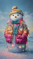 Sneeuwpop Glow - Dit is een vrolijk en een tikje ondeugend sneeuwpop schilderij, waarin twee elementen meteen je aandacht grijpen: de grote vriendelijke sneeuwpop zelf en zijn knalgekleurde donsjas met lichtjes. Ik liet de sneeuwpop heel centraal en tastbaar voelen — bol, zacht, met een eenvoudig wortelneusje en twee donkere ogen —…