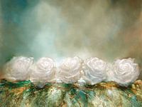 Realistisch bewerkte bloesems vol licht en weidsheid. Witte rozen doen denken aan sneeuwvlokken. Zij liggen op een abstract geschilderd gestructureerd oppervlak.