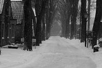Sneeuwstorm winter gezicht op Ameland. Centrum dorp Nes. Waddeneiland