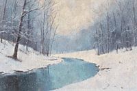 Een ijzige rivier slingert zich door een besneeuwd landschap, omgeven door kale bomen die zacht bedekt worden door vallende sneeuwvlokken. De lucht is zacht grijsblauw, de stilte bijna hoorbaar. In deze scène lijkt de tijd stil te staan — een moment van absolute rust.