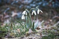 Sneeuwvlokjes in een weide met fijne bloemblaadjes. Vroege bloeier