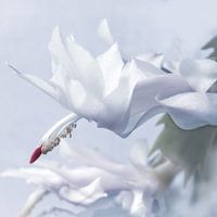 De sneeuwwitte bloemblaadjes van de kerstcactus bloeien als delicate sneeuwvlokjes en creëren een etherisch en magisch schouwspel van pure botanische schoonheid. De kerstcactus, lidcactus of Schlumbergera truncata is een geliefde kamerplant die bloeit in de winter rond de feestdagen. Hier is hij vastgelegd in een elegante foto met een zacht, ingetogen kleurenpalet. Prachtige botanische kunst om je woonruimte deze feestdagen mee te versieren.