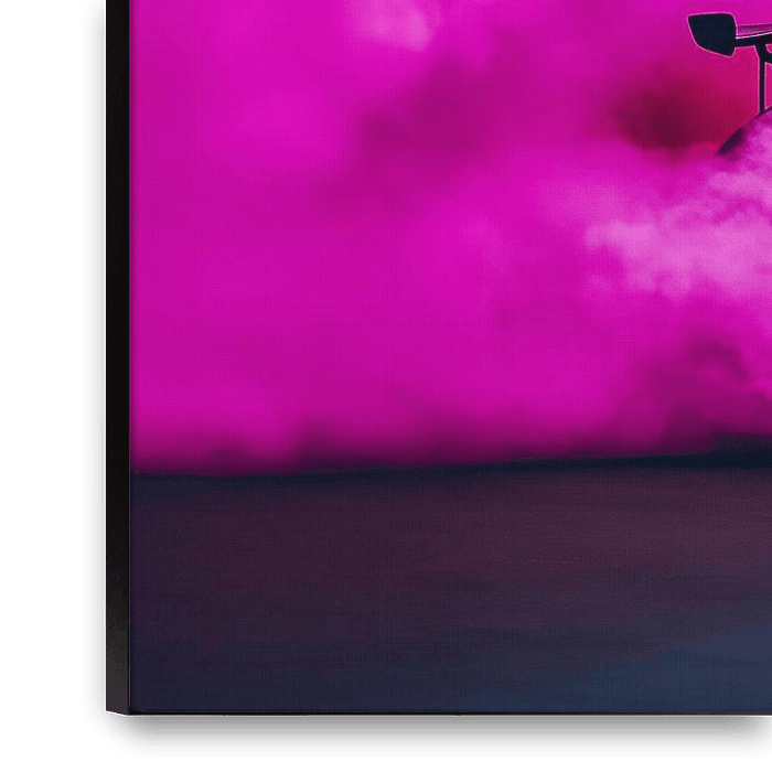 'Snelheid Rook Supercar' vormt samen met 'Hyperkleur Drift' een panoramisch tweeluik. De auto snijdt een bocht terwijl lila en kobalt­blauwe rook sierlijk omhoog kringelt tegen een bijna nacht­zwarte achtergrond. Het moment werd geïnspireerd tijdens de zogenaamde “golden hour” op het circuit, koud avond­licht ontmoette warme…