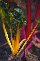 Over ‘Snijbiet met gele en rode stengels groeit in een bed.’ van Edith Albuschat